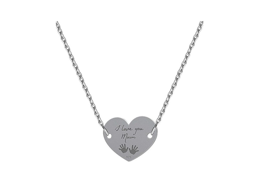 Jemný strieborný náhrdelník so srdiečkom. Na srdiečku je nápis I love you mum a vygravírované ruky.