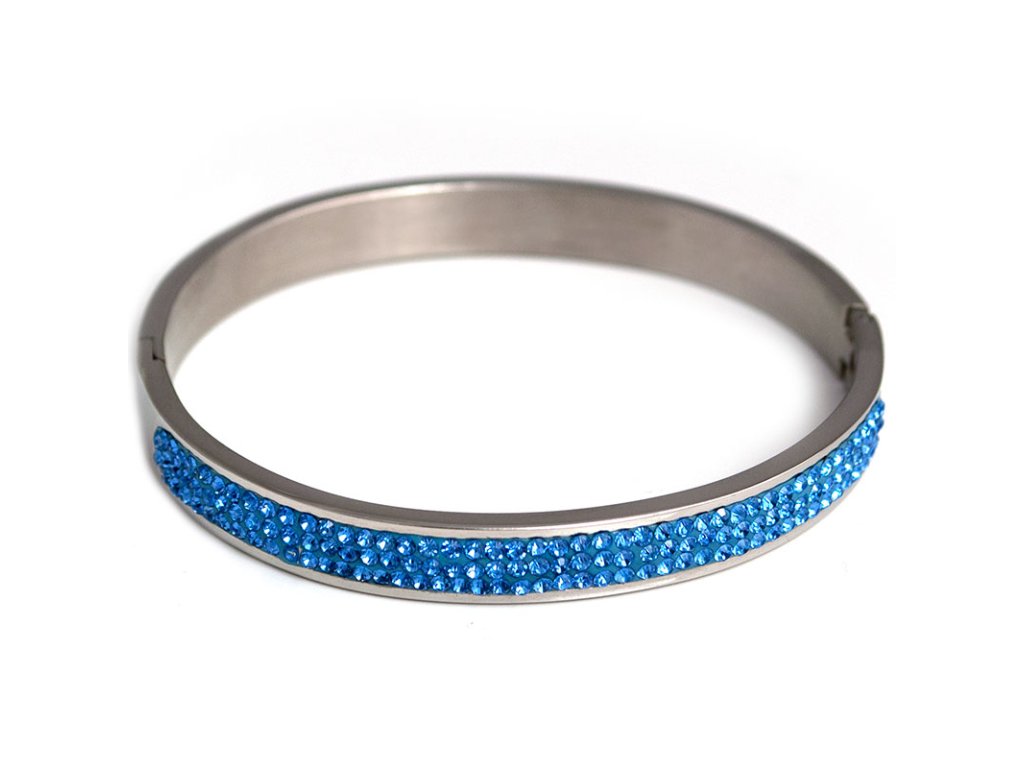 Krásny, elegantný náramok z chirurgickej ocele osadený modrými zirkónmi.