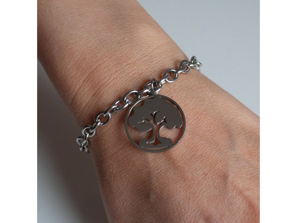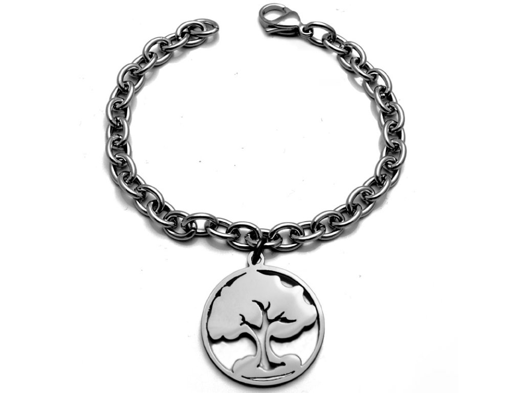 Krásny, jednoduchý náramok z chirurgickej ocele s príveskom - stromom.