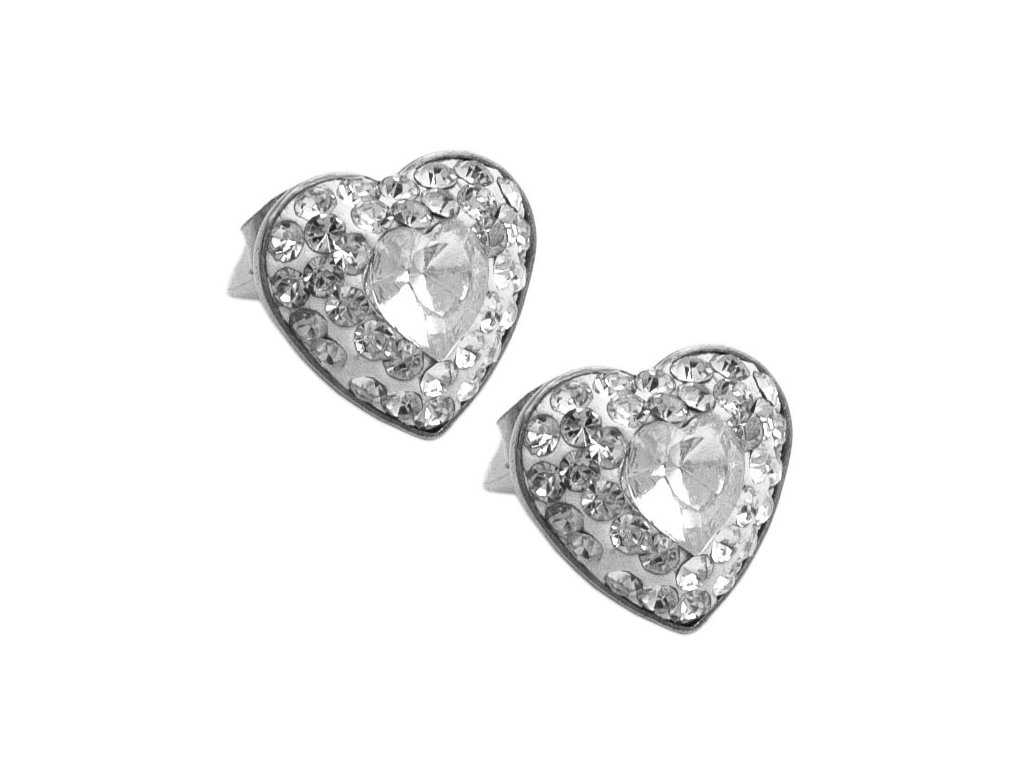 Nádherné, ligotavé náušnice z chirurgickej ocele, osadené čírymi zirkónmi. Náušničky sú v tvare srdiečok. Rovnaký tvar má aj hlavný krištál uprostred nich. Osadené sú dvoma veľkosťami krištálov (okrem hlavného srdiečkového sú obsypané drobnými krištálikmi), čo ešte viac zdôrazňuje ich ligot.