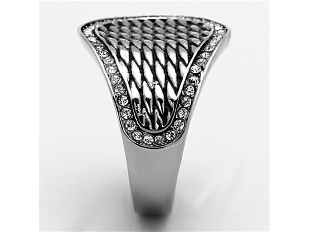 Krásne prepracovaný prsteň z chirurgickej ocele, osadený drobnými čírymi kubickými zirkónikmi.