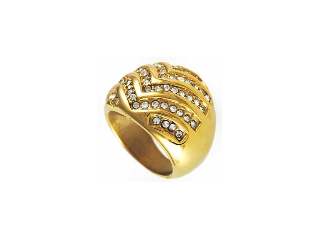 Nádherný, výrazný prsteň z chirurgickej ocele, osadený čírymi zirkónmi, potiahnutý žltým kovom.