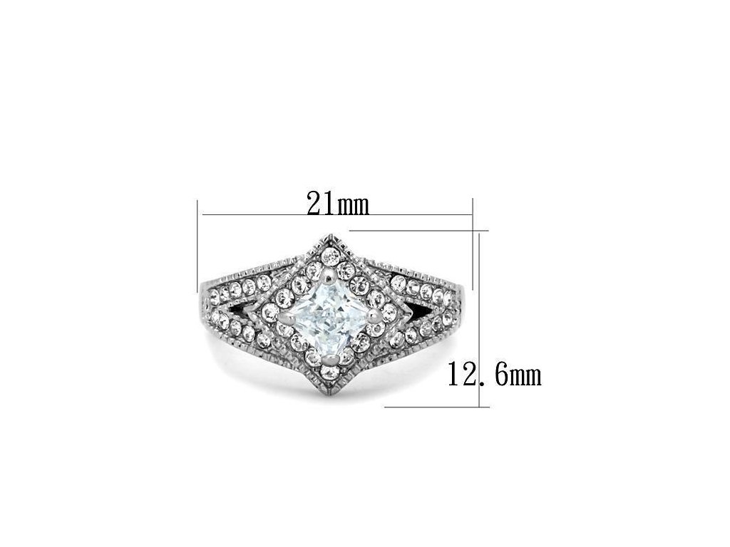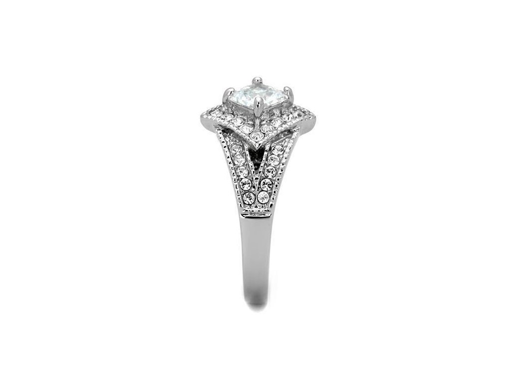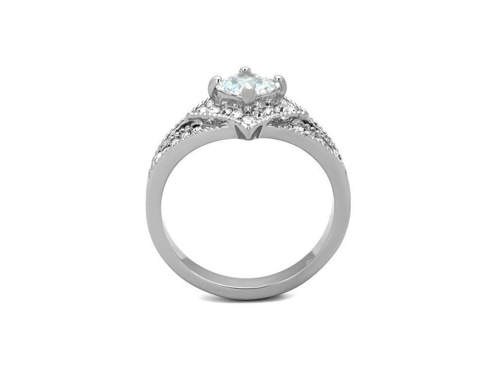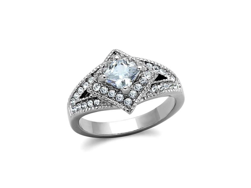 Nádherný, priam kráľovský prsteň z chirurgickej ocele, osadený jedným väčším a dozdobený drobnejšími čírymi kubickými zirkónmi.