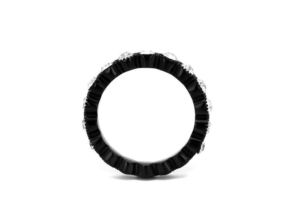 Elegantný prsteň z chirurgickej ocele potiahnutý čiernym kovom a takmer po celom obvode osadený čírymi kubickými zirkónmi.