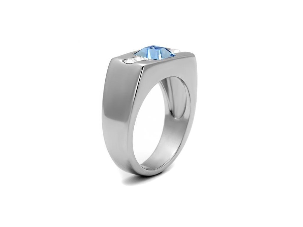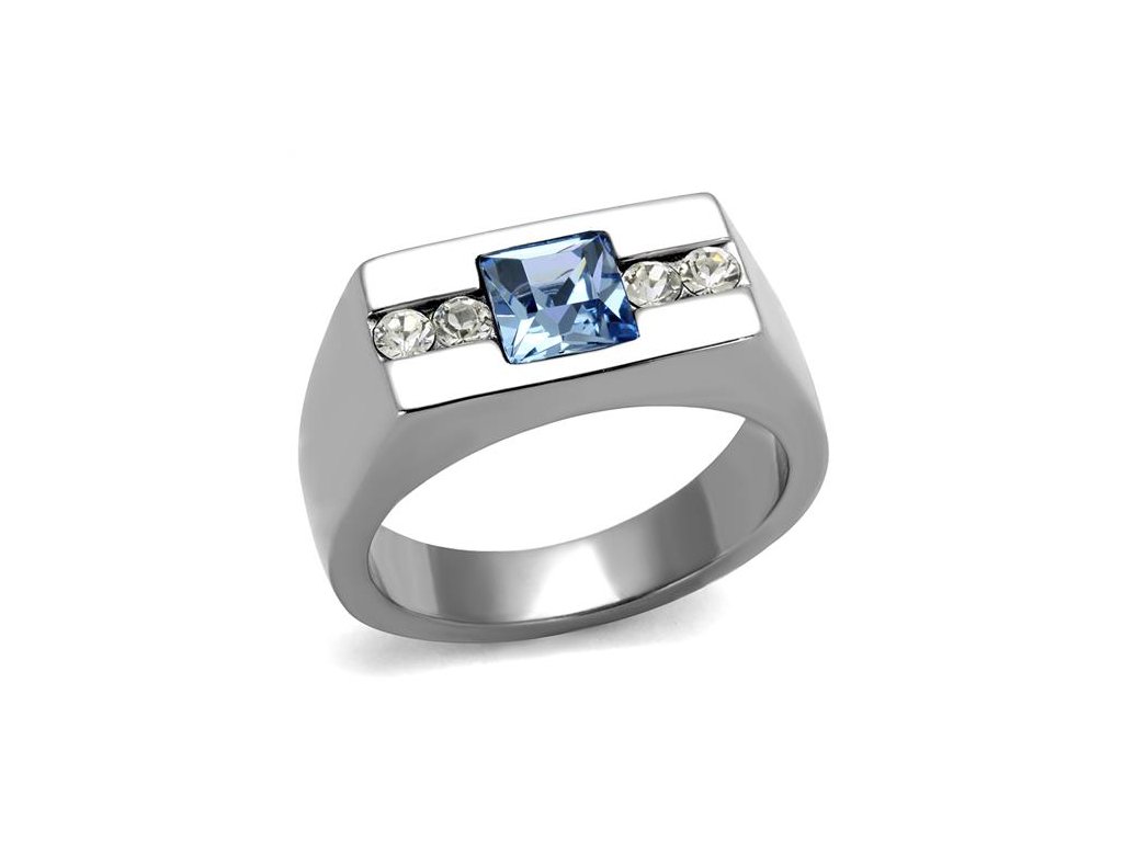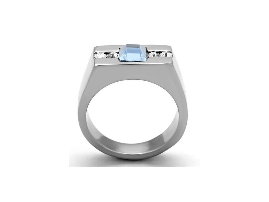 Pánsky prsteň z chirurgickej ocele, osadený čírymi a svetlomodrými zirkónmi.