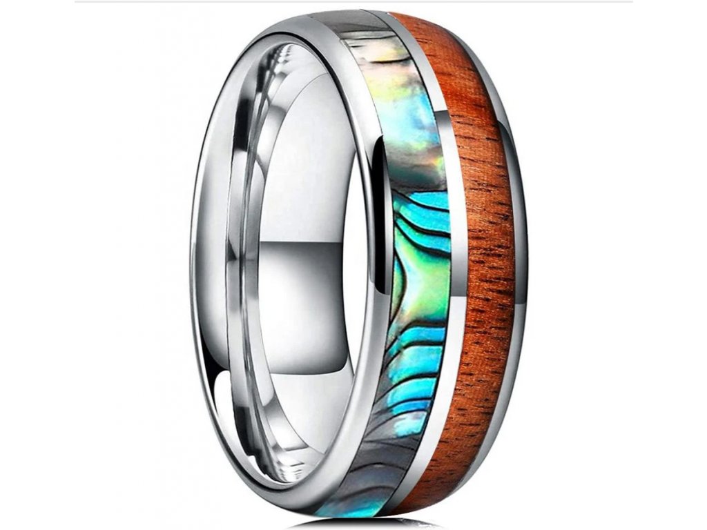 Nádherný prsteň - obrúčka z chirurgickej ocele s exotickým drevom a mušľovinou. Jedinečný šperk vhodný pre každodenné nosenie.